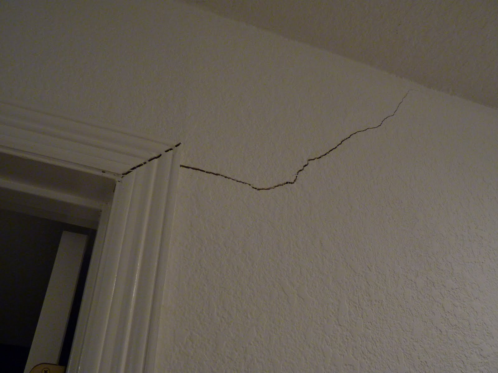 This deep crack runs from the top of the molding around the closet door in the Master Bedroom, from the upper left corner.